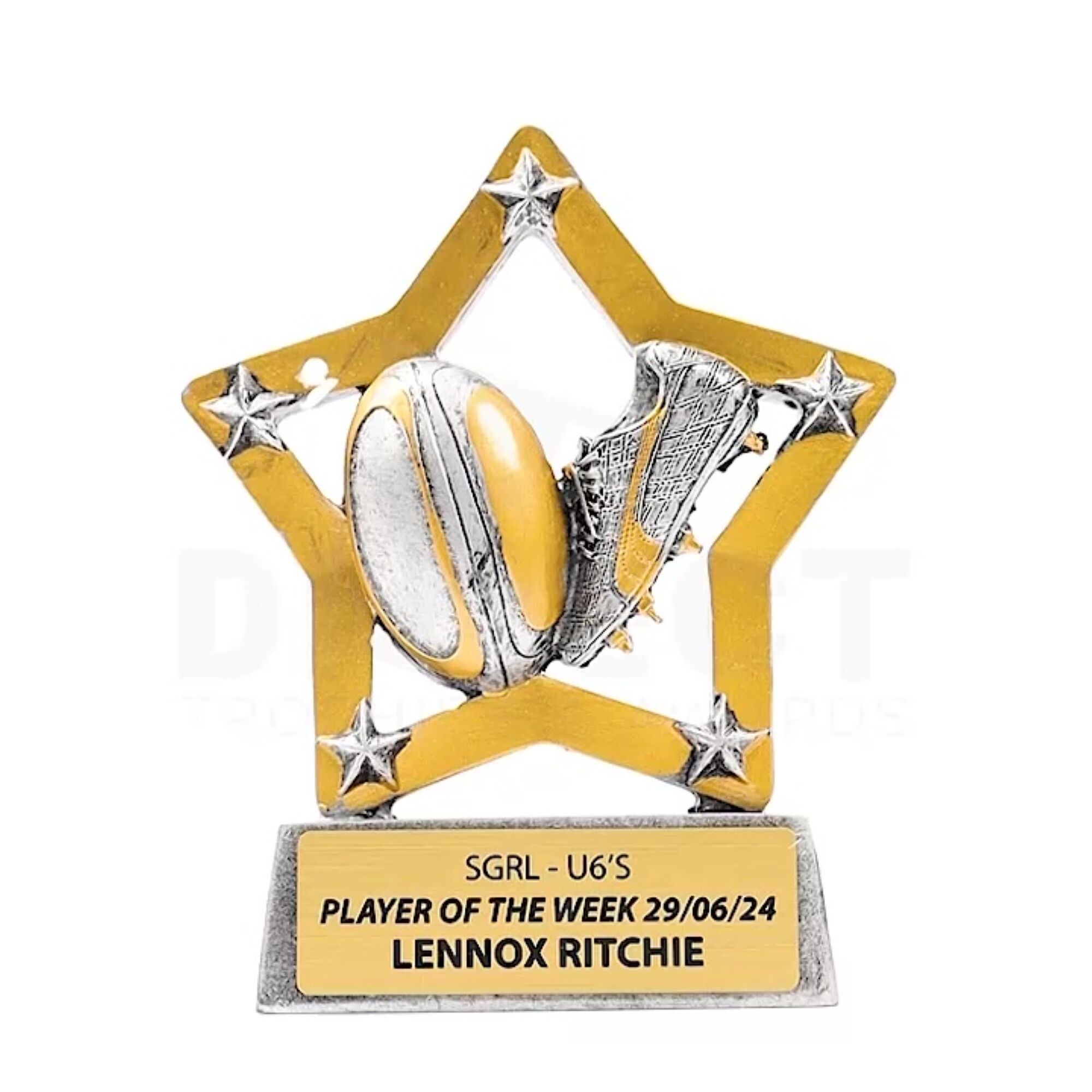 Popular Mini Star trophy ideal for players of all ages and suitable for League or Union. An attractive star inspired design for your star performers. Finished in classic silver and gold colours, this award is perfect for bulk orders.