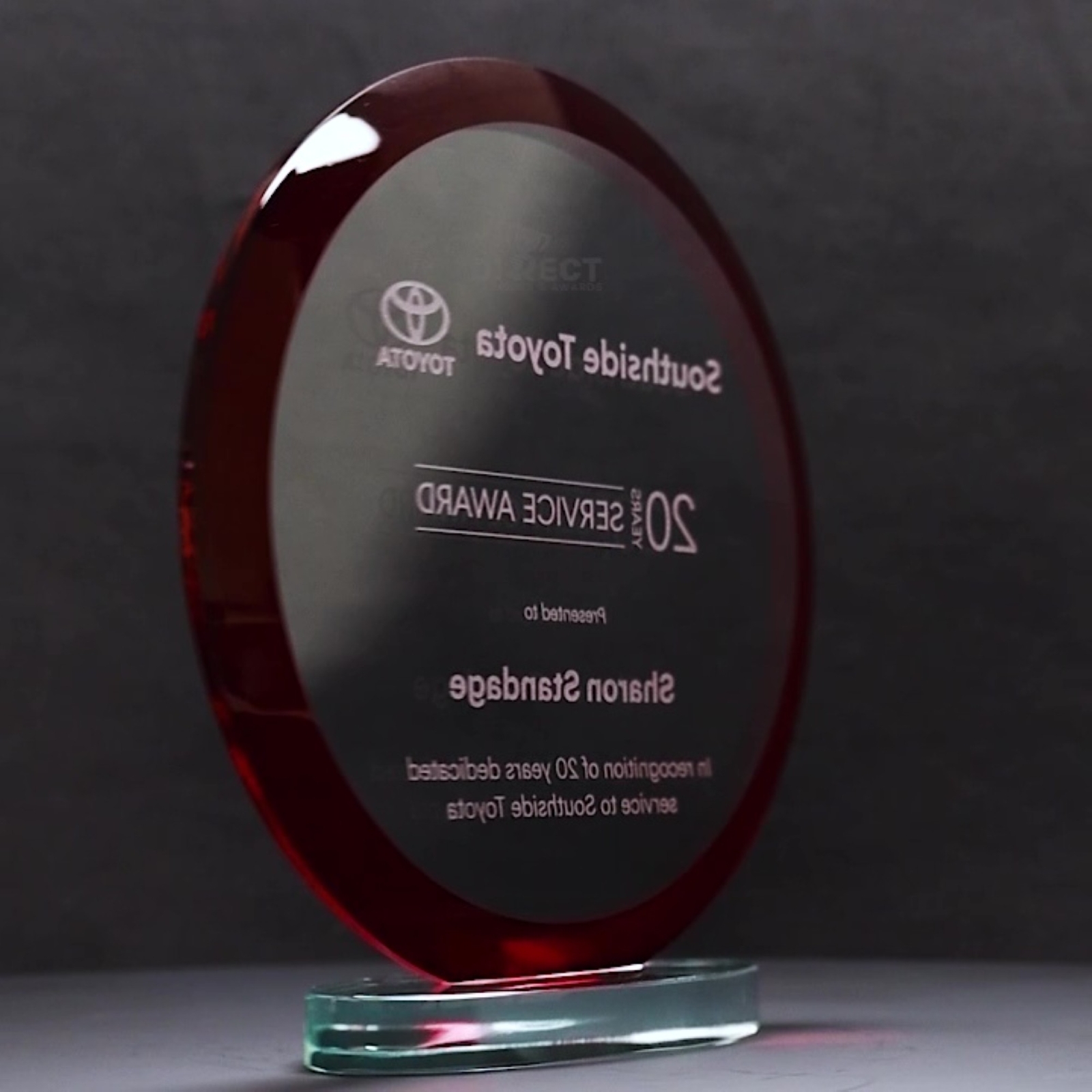 Introducing the Sage Glass Red Trophy: part of a series offering captivating design in bold colour, featuring ample engraving space. A prestigious choice for your awardees, combining elegance with exceptional affordability. Each trophy is elegantly presented in a gift box for a memorable presentation.