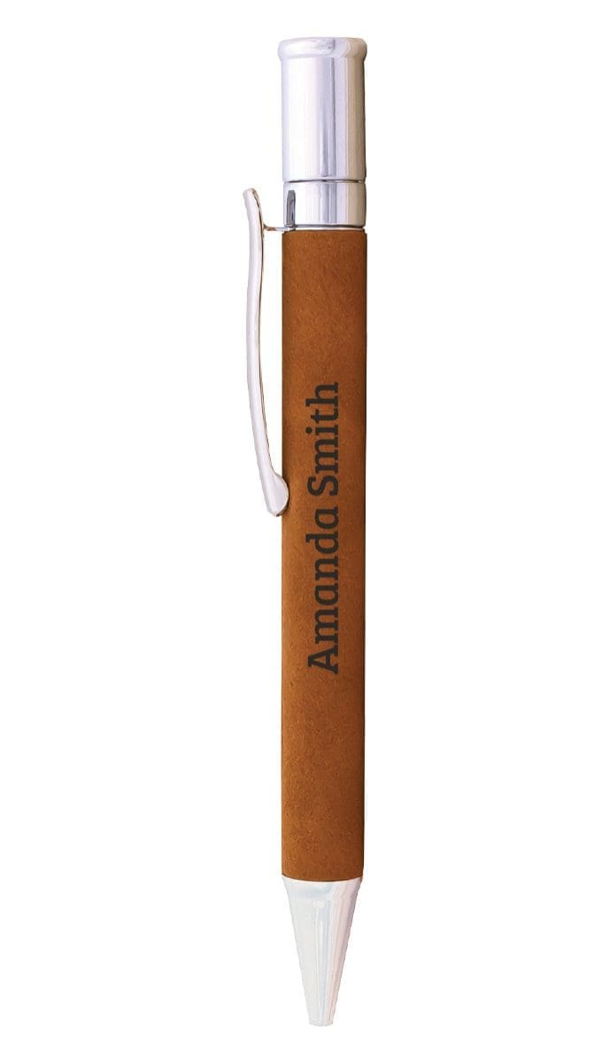 The diverse range of leatherette products offer different options for your engravable gift item. Leatherette allows for an affordable medium and durable engraving results. Single pen in rawhide colour and chrome trim finish.