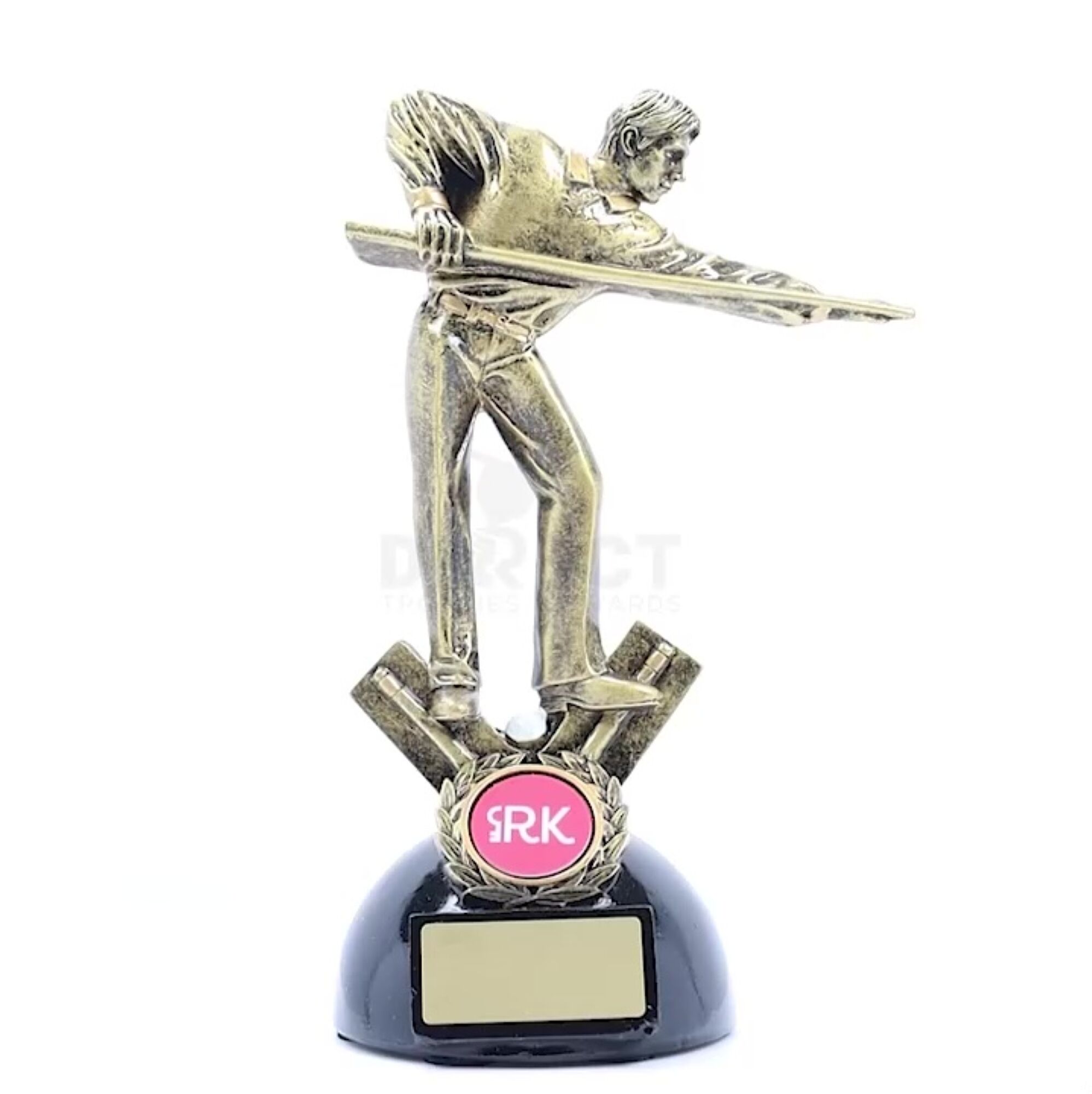 Introducing the Snooker Pool Ace Accolade Trophy: This popular sculptured trophy series is perfect for snooker or pool events and presentations. Available in three convenient sizes, these trophies are finished in classic antique gold colors. Enjoy the added bonus of free laser engraving to personalize the trophy.
