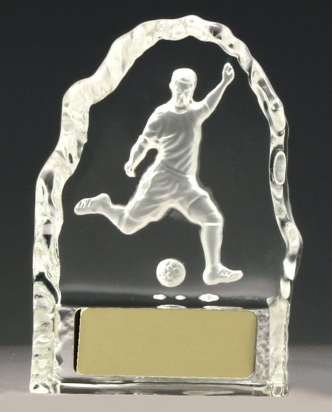 Affordable crystal iceberg award design features a detailed football player. A versatile trophy suitable for a range of soccer events & presentation. Space for your engraving and available in a presentation gift box.
