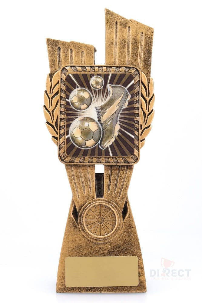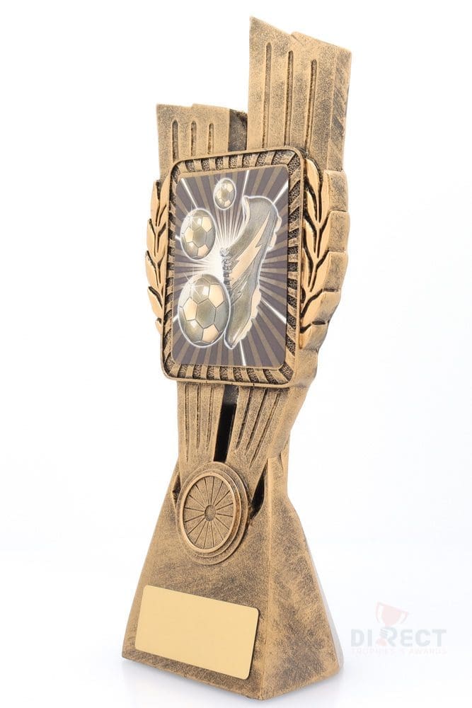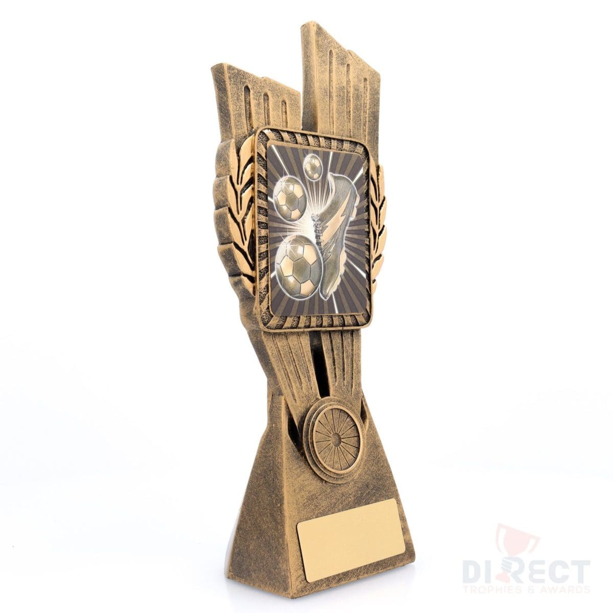 This Antique Gold Lynx Trophy is the perfect theme award for players of all ages for your football order. Featuring a classic wreath and vibrant soccer boot & ball theme design, this trophy is customisable and available in 4 impressive sizes.