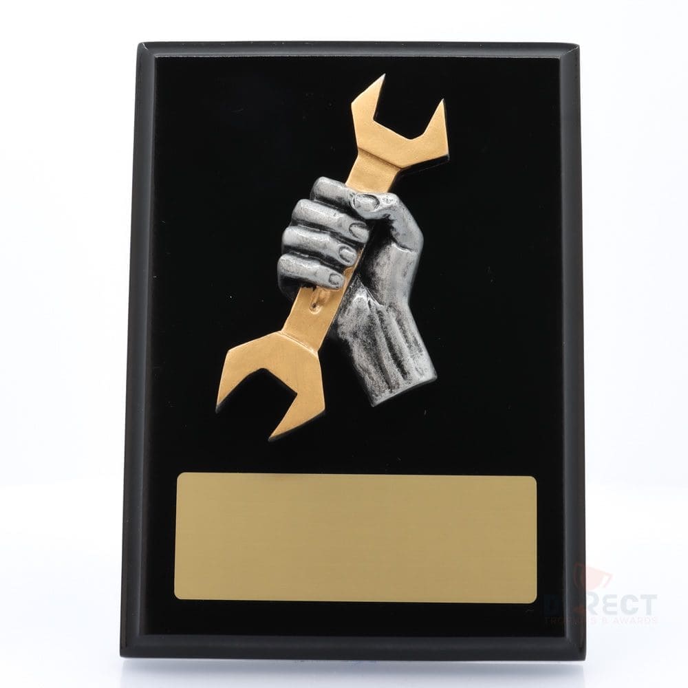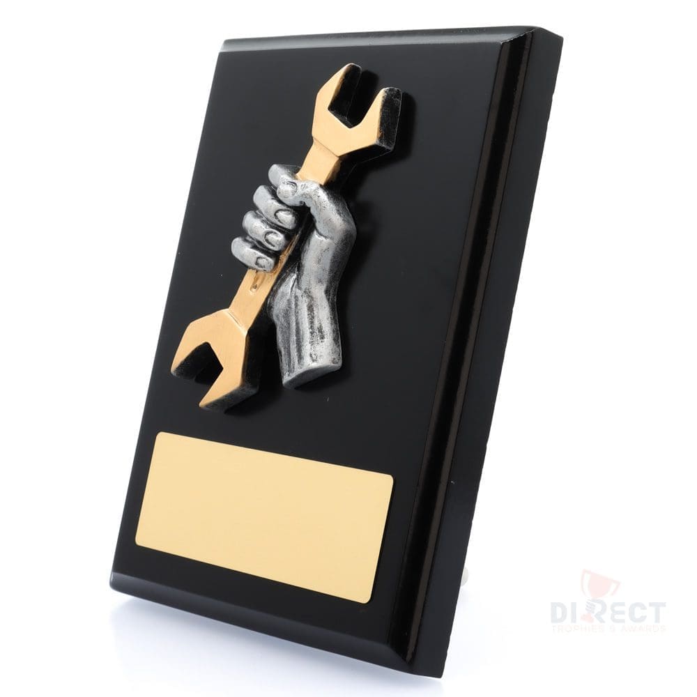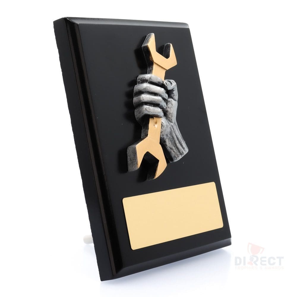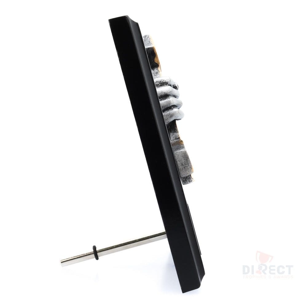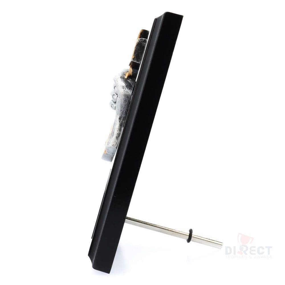 A classic black plaque with striking novelty front accompanied with a european gold plate showing black text engraving. Plaque includes silver screw on stand for display.
