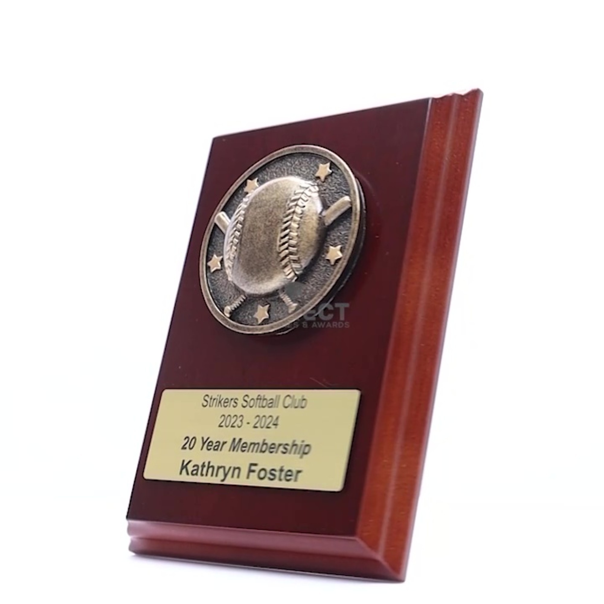 A classic walnut timber plaque with 2D Spartan activity front accompanied with a european gold plate showcasing black text engraving. Plaque includes silver screw on stand for display. Free Engraving included.