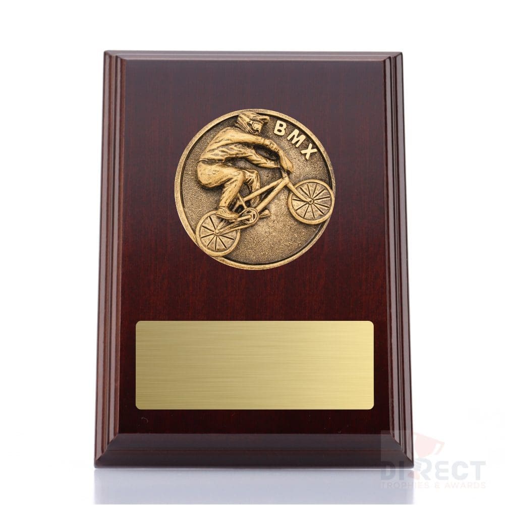 A classic walnut timber plaque with 2D Spartan activity front accompanied with a european gold plate showcasing black text engraving. Plaque includes silver screw on stand for display. Free Engraving included.