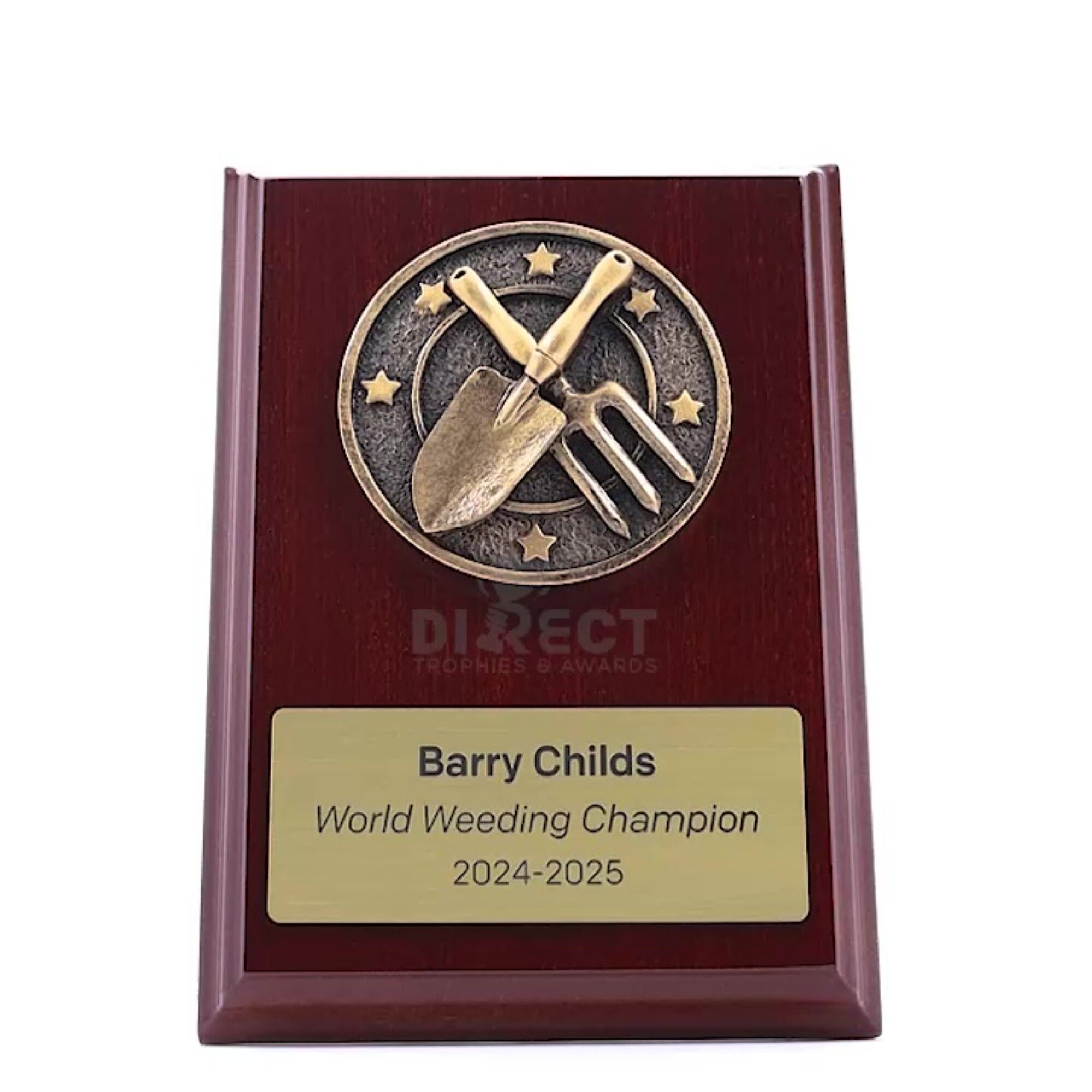 A classic walnut timber plaque with 2D Spartan activity front accompanied with a european gold plate showcasing black text engraving. Plaque includes silver screw on stand for display. Free Engraving included.