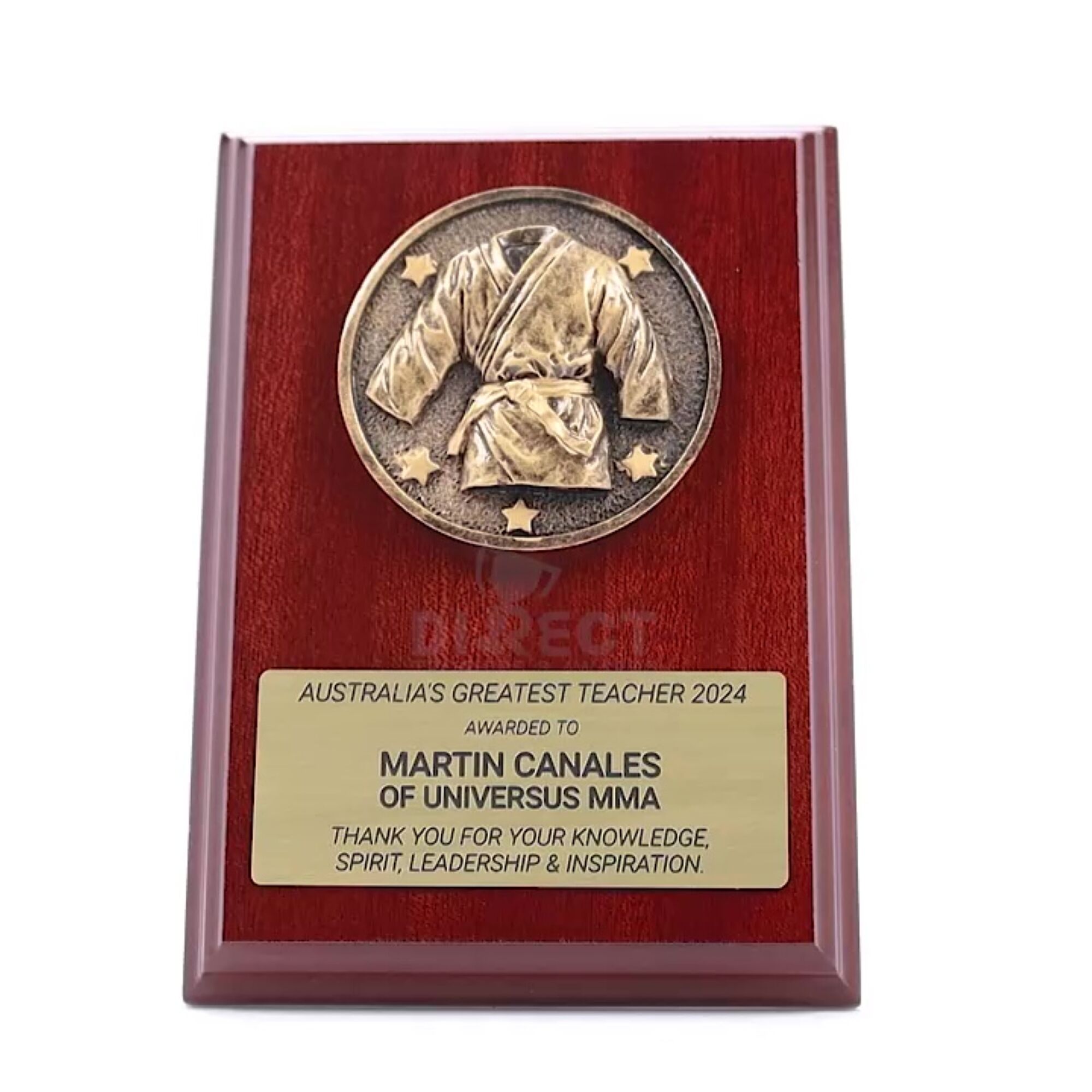 A classic walnut timber plaque with 2D Spartan activity front accompanied with a european gold plate showcasing black text engraving. Plaque includes silver screw on stand for display. Free Engraving included.