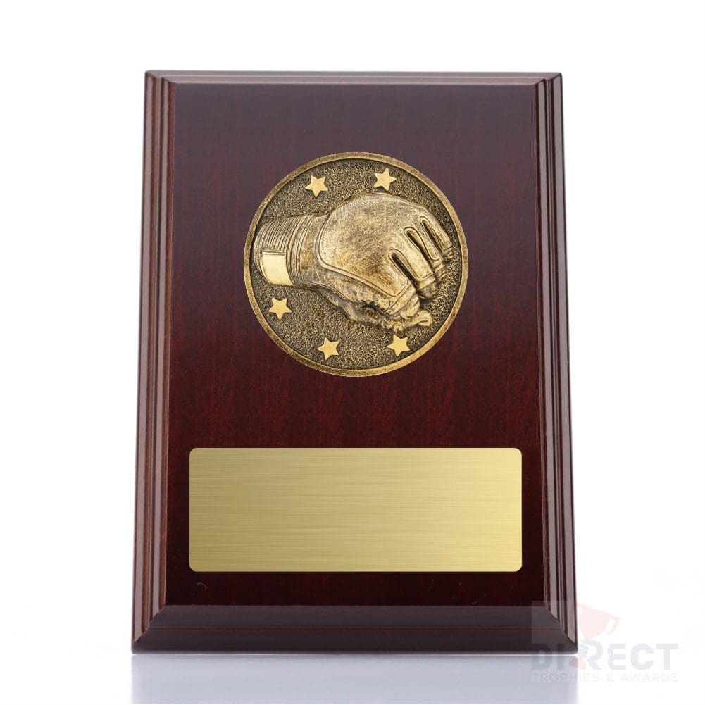 A classic walnut timber plaque with 2D Spartan activity front accompanied with a european gold plate showcasing black text engraving. Plaque includes silver screw on stand for display. Free Engraving included.