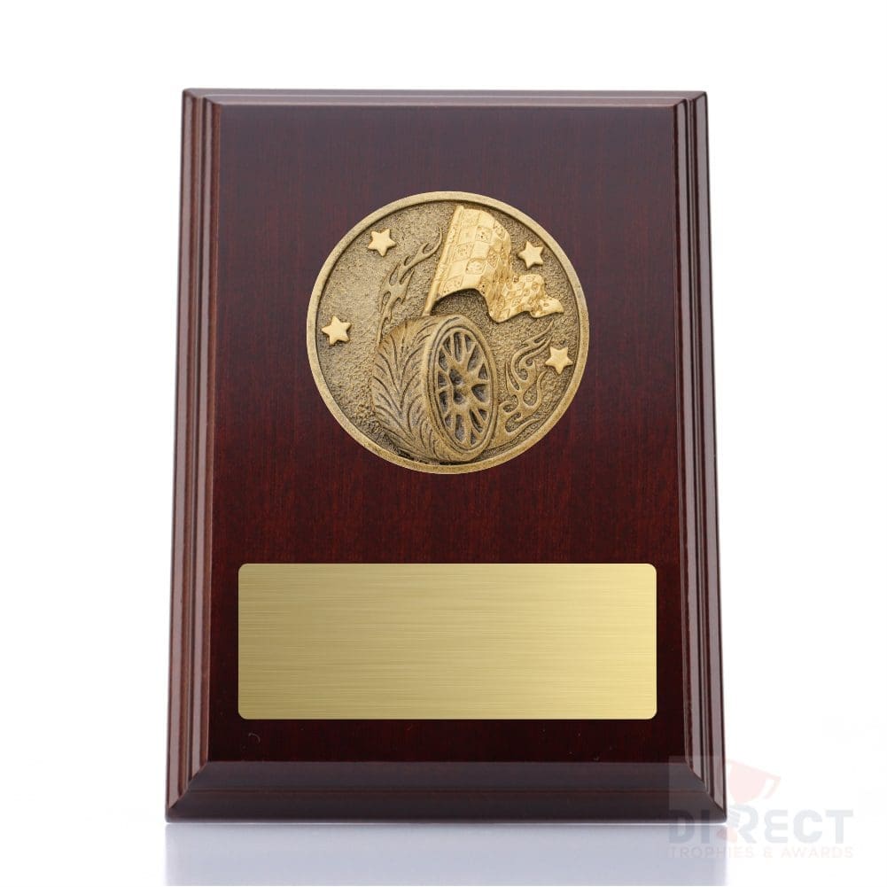 A classic walnut timber plaque with 2D Spartan activity front accompanied with a european gold plate showcasing black text engraving. Plaque includes silver screw on stand for display. Free Engraving included.