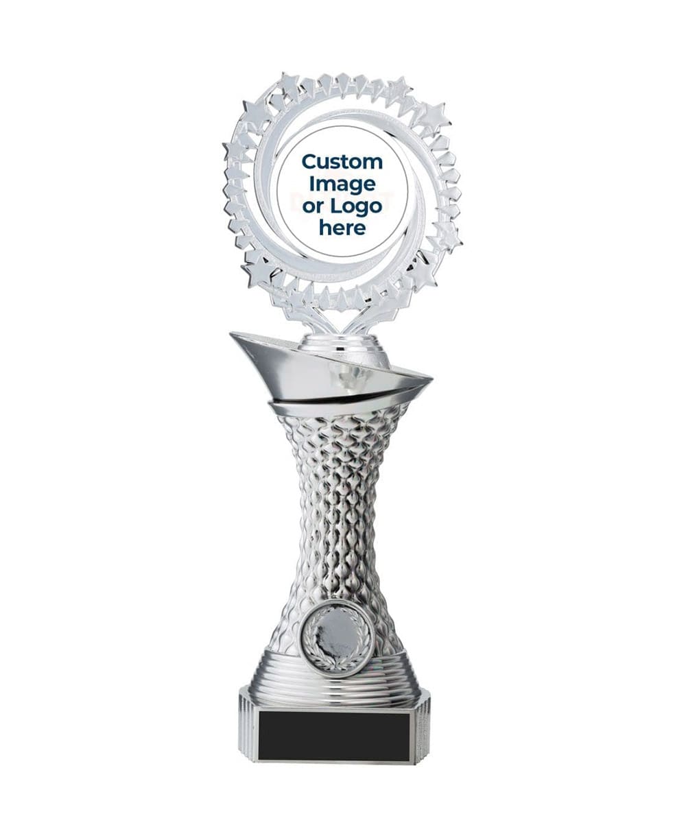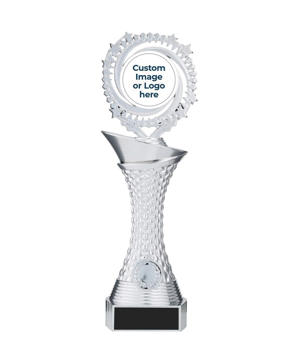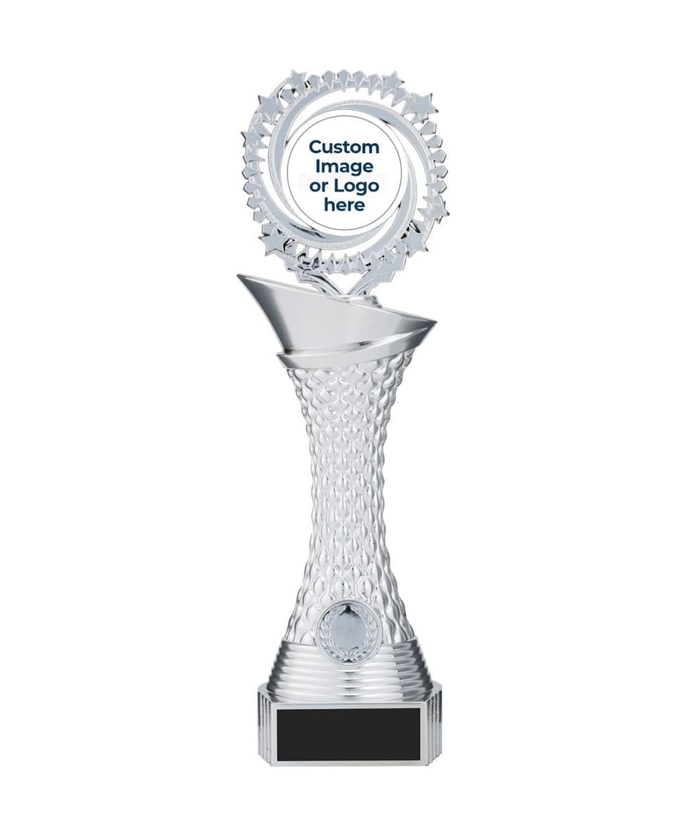 Spire Pinnacle Silver Trophy, represents ribbed stem design with modern silver finish. Available in multiple sizes.