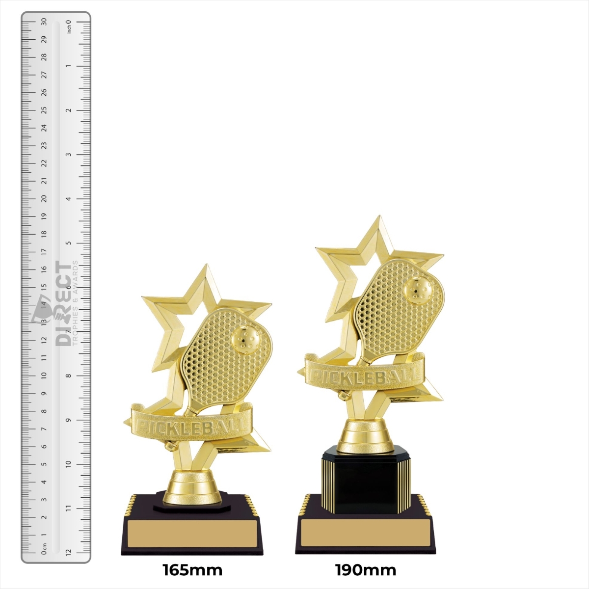 The Star Gold Pickleball Trophy combines a classic design with a radiant gold top and elegant column detail. Available in two practical sizes, it includes complimentary laser engraving for personalised recognition.
