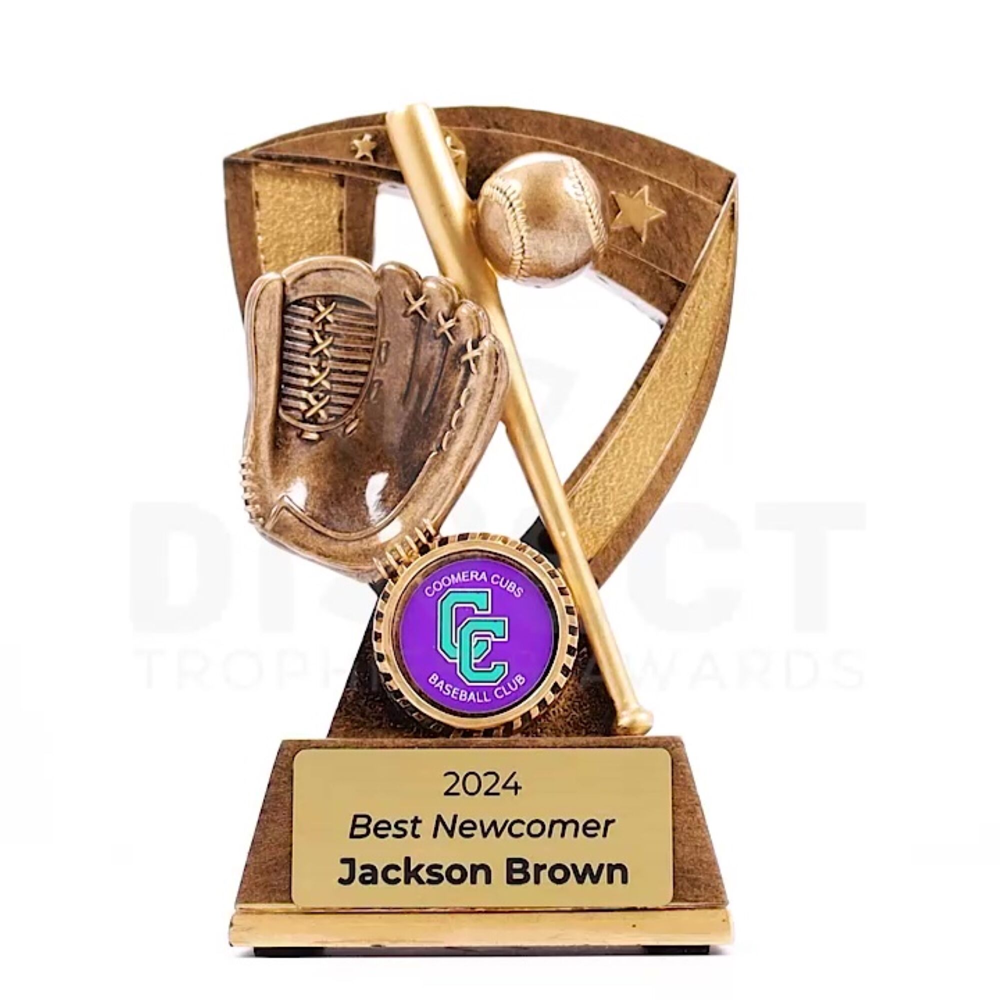 The Starcrest Series Trophy, crafted in shield resin with star-studded cutouts and a sport icon, features an antique gold finish. Ideal for participation awards, it includes space for your custom image and complimentary laser engraving.