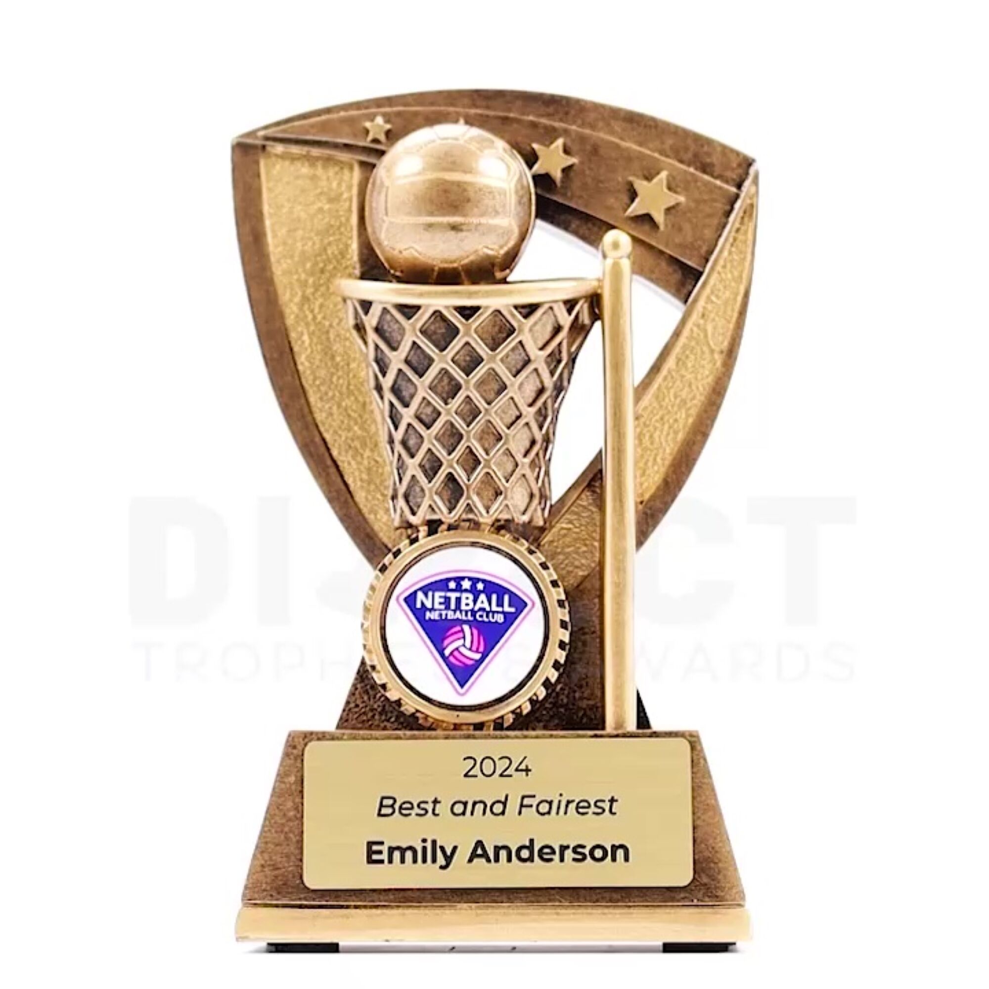 The Starcrest Series Trophy, crafted in shield resin with star-studded cutouts and a sport icon, features an antique gold finish. Ideal for participation awards, it includes space for your custom image and complimentary laser engraving.