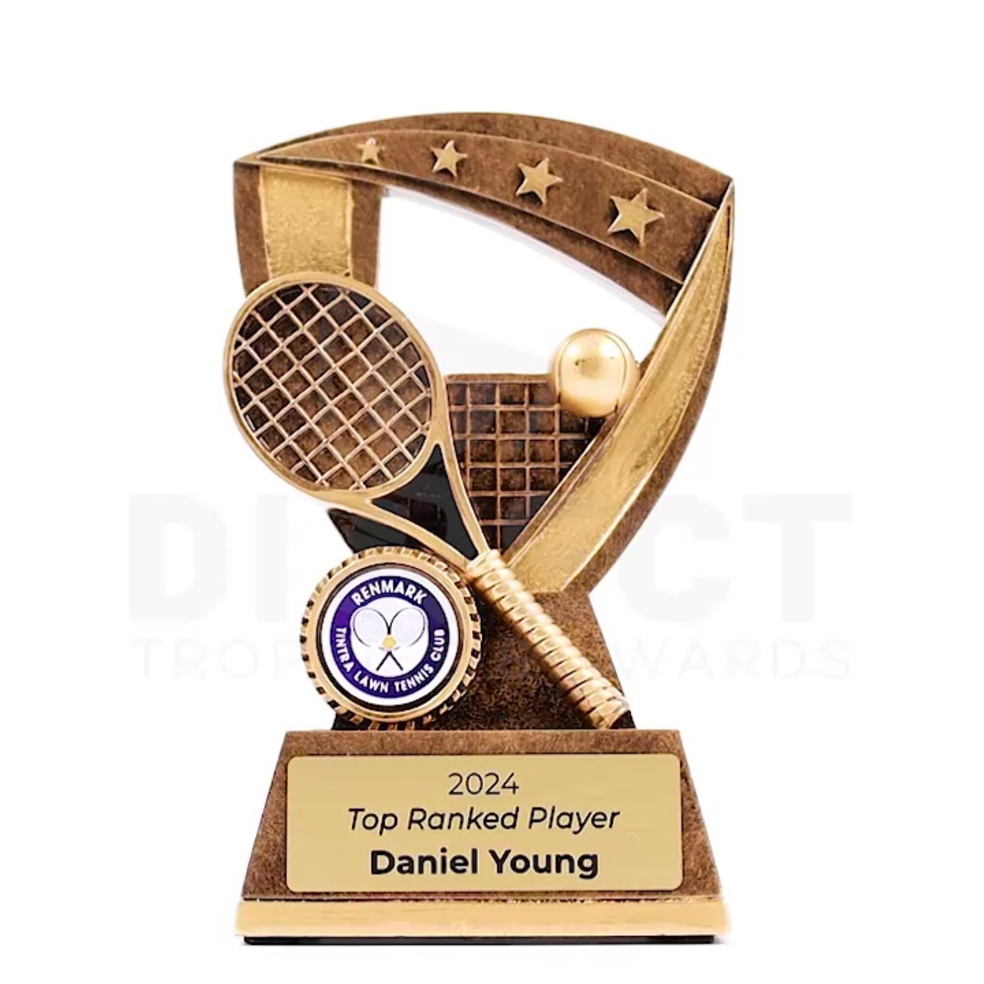 The Starcrest Series Trophy, crafted in shield resin with star-studded cutouts and a sport icon, features an antique gold finish. Ideal for participation awards, it includes space for your custom image and complimentary laser engraving.
