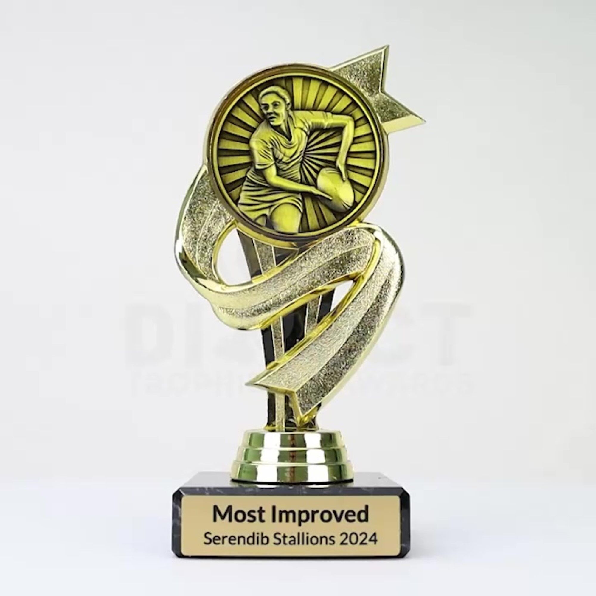 Presenting the Steanant Rugby Female Trophy, featuring an excellent ribbon swirl design. This affordable trophy is perfect for your female participation awards, with the option for free laser engraving to add a personalized touch.
