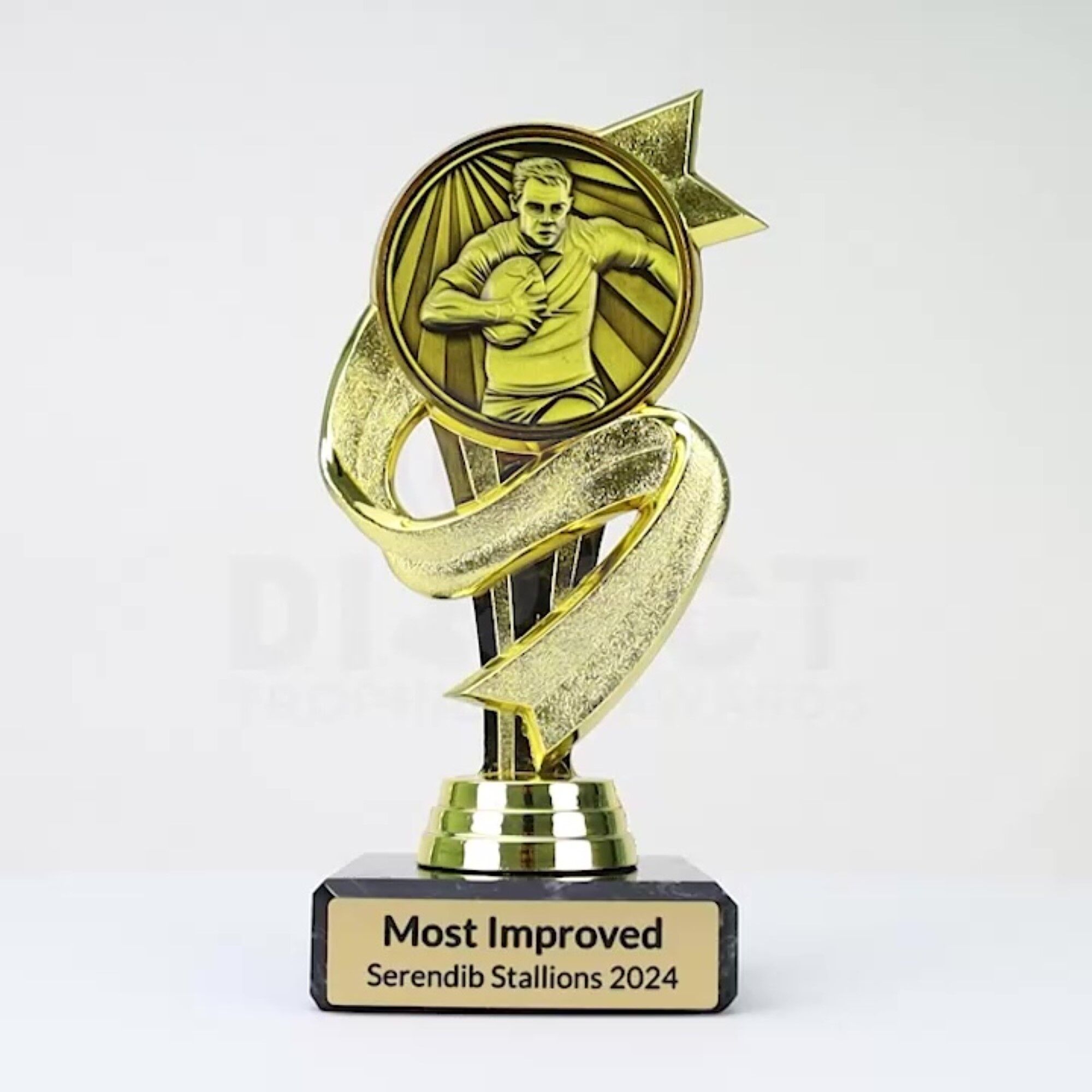 Presenting the Steanant Rugby Male Trophy, featuring an excellent ribbon swirl design. This affordable trophy is perfect for your male participation awards, with the option for free laser engraving to add a personalized touch.