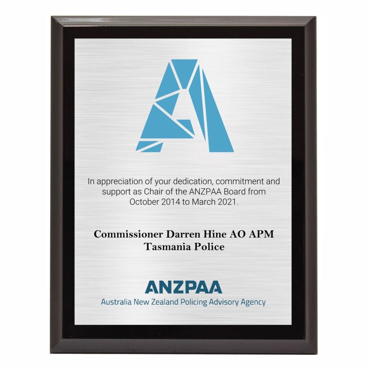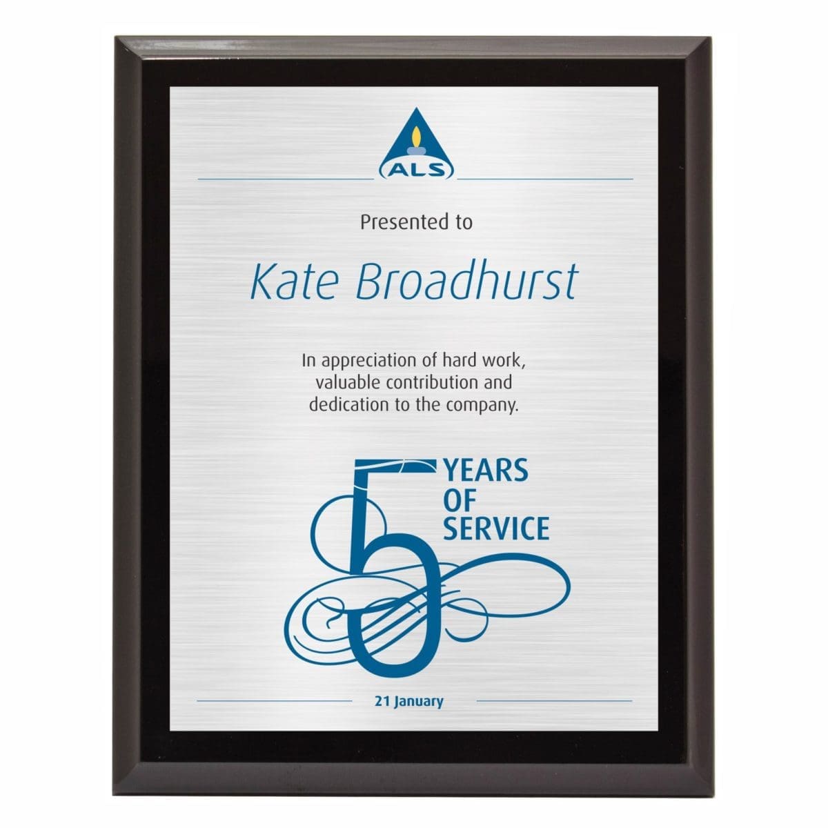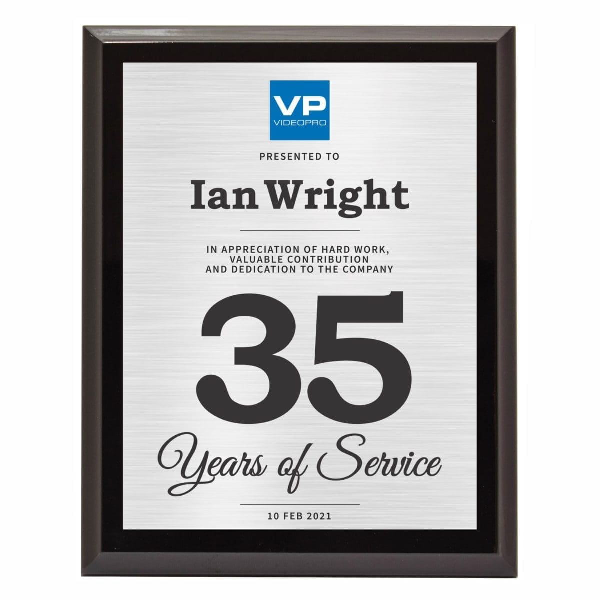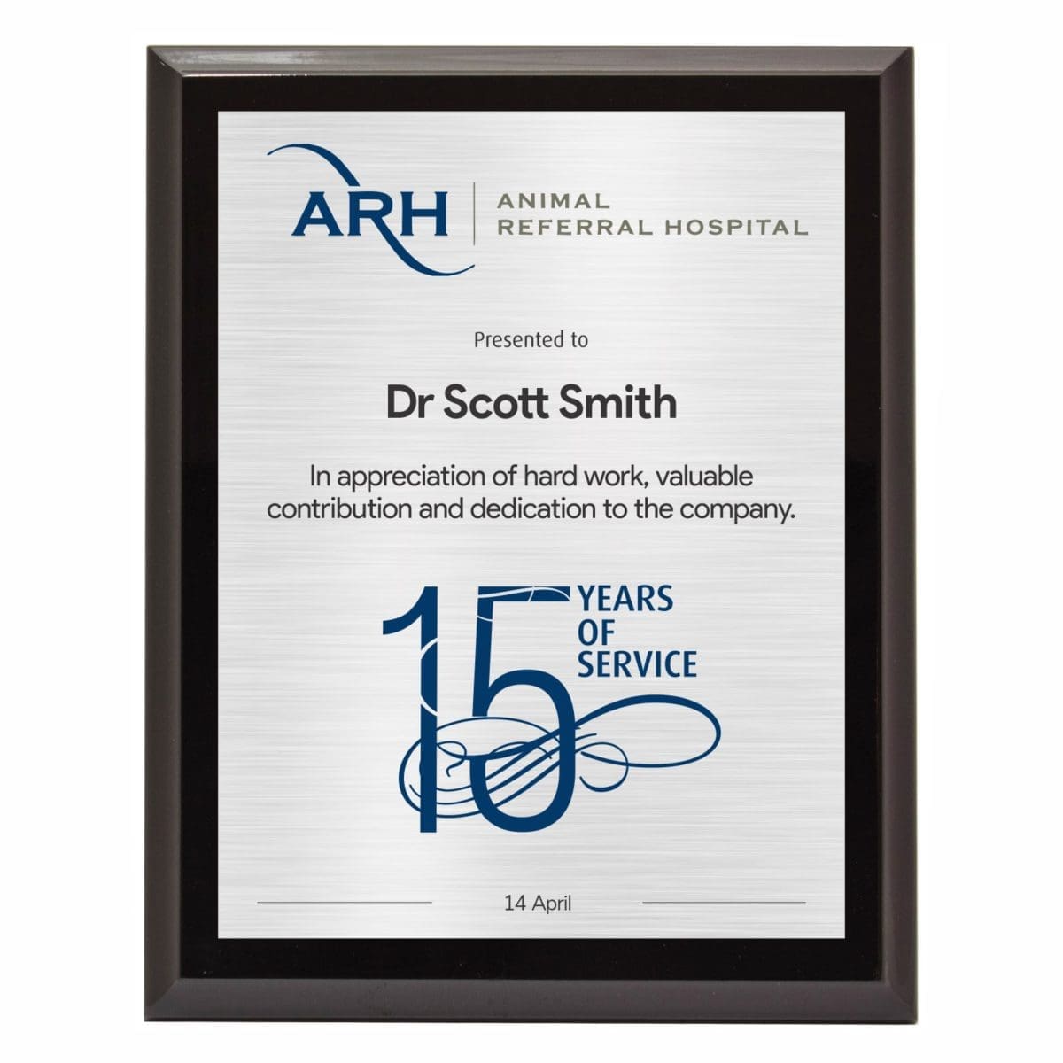 Corporate colour printed plaque with extra glossy finish for that premium award in different sizes. Comes in a black presentation case and metal back-stands.