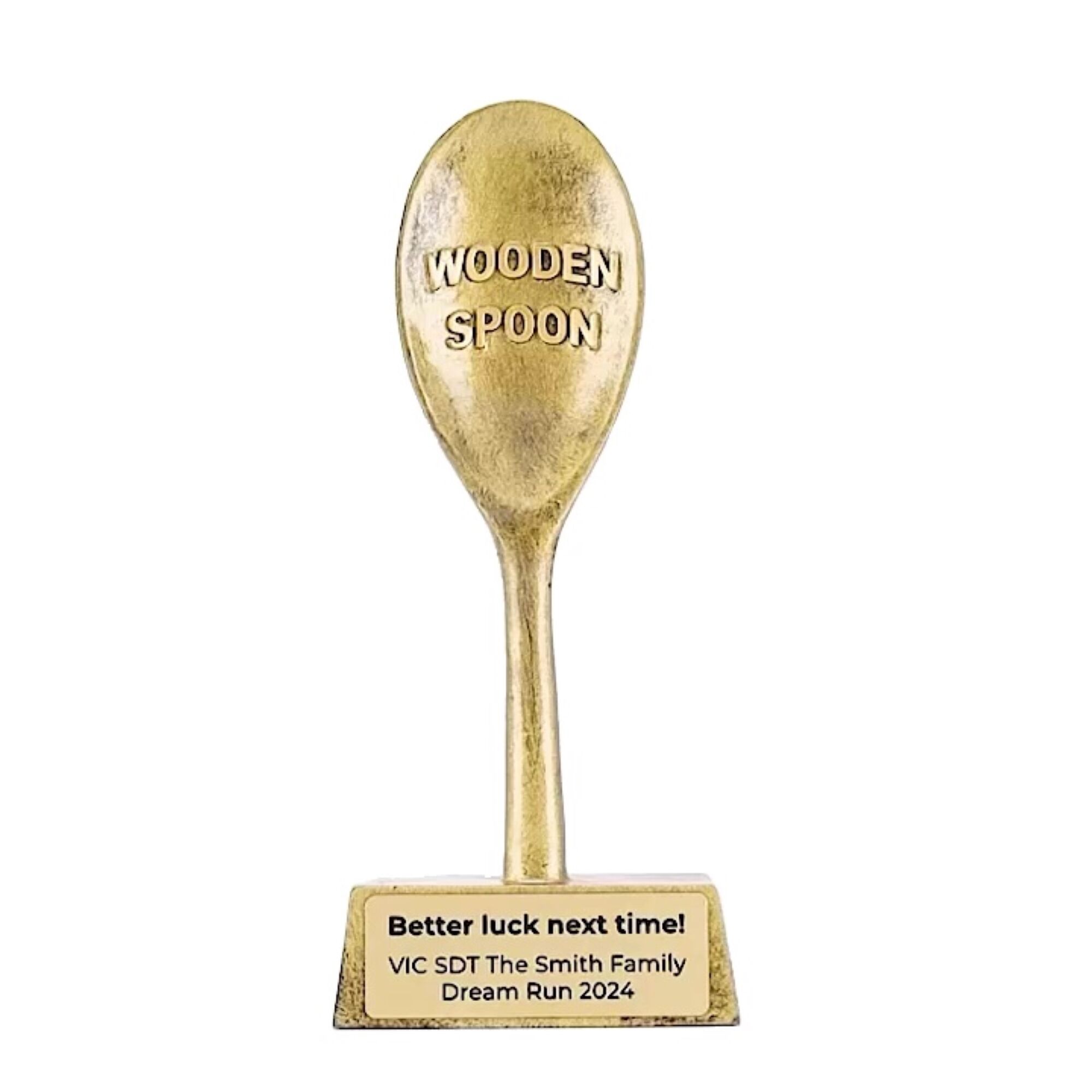 Present the ‘Wooden Spoon’ to the well deserved recipient of your group to mark their dubious achievements. Finished in classic antique gold trophy colour and with adequate space for your engraving requirements.