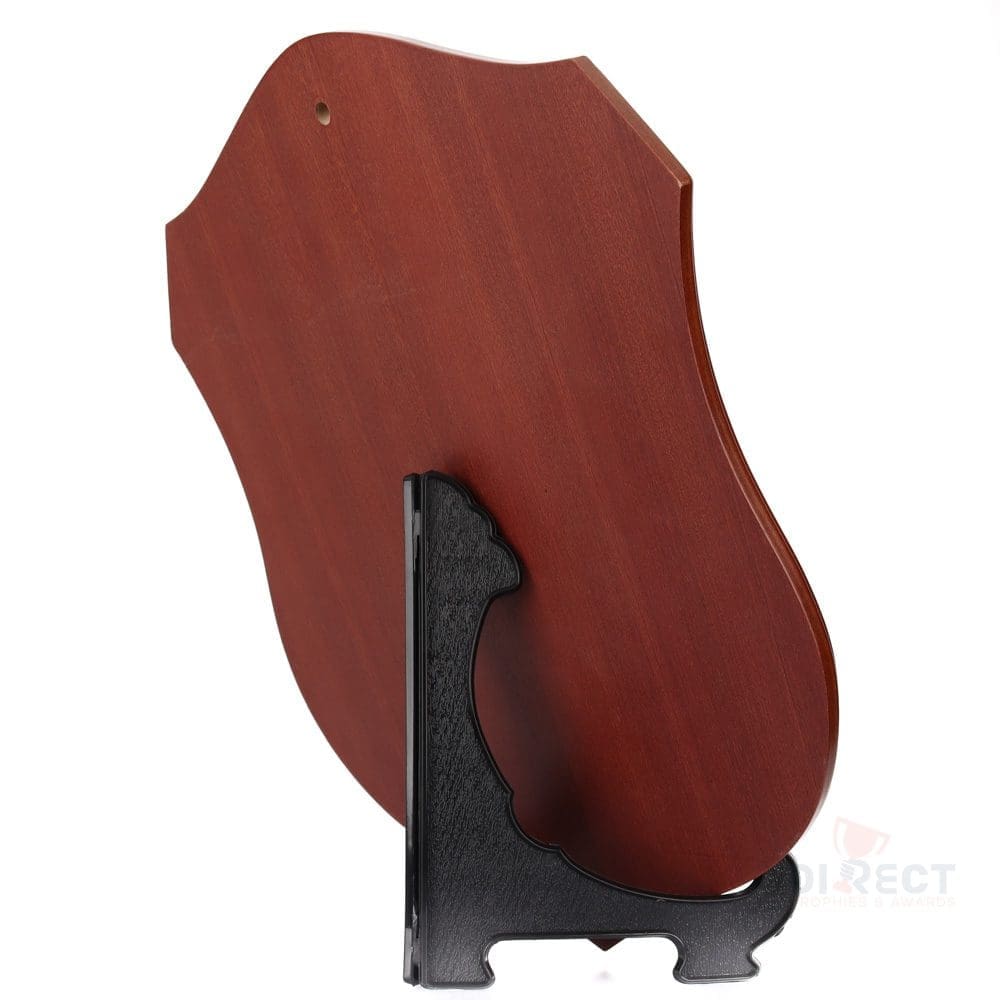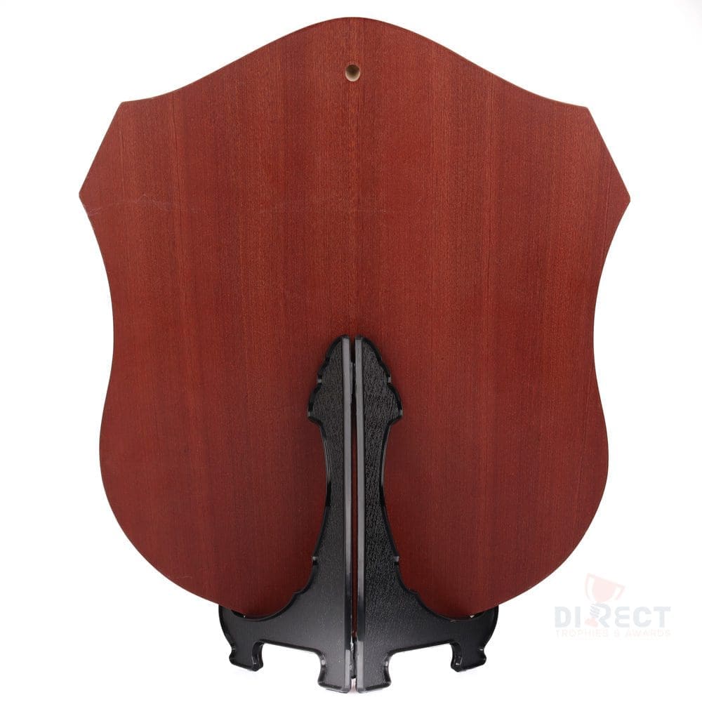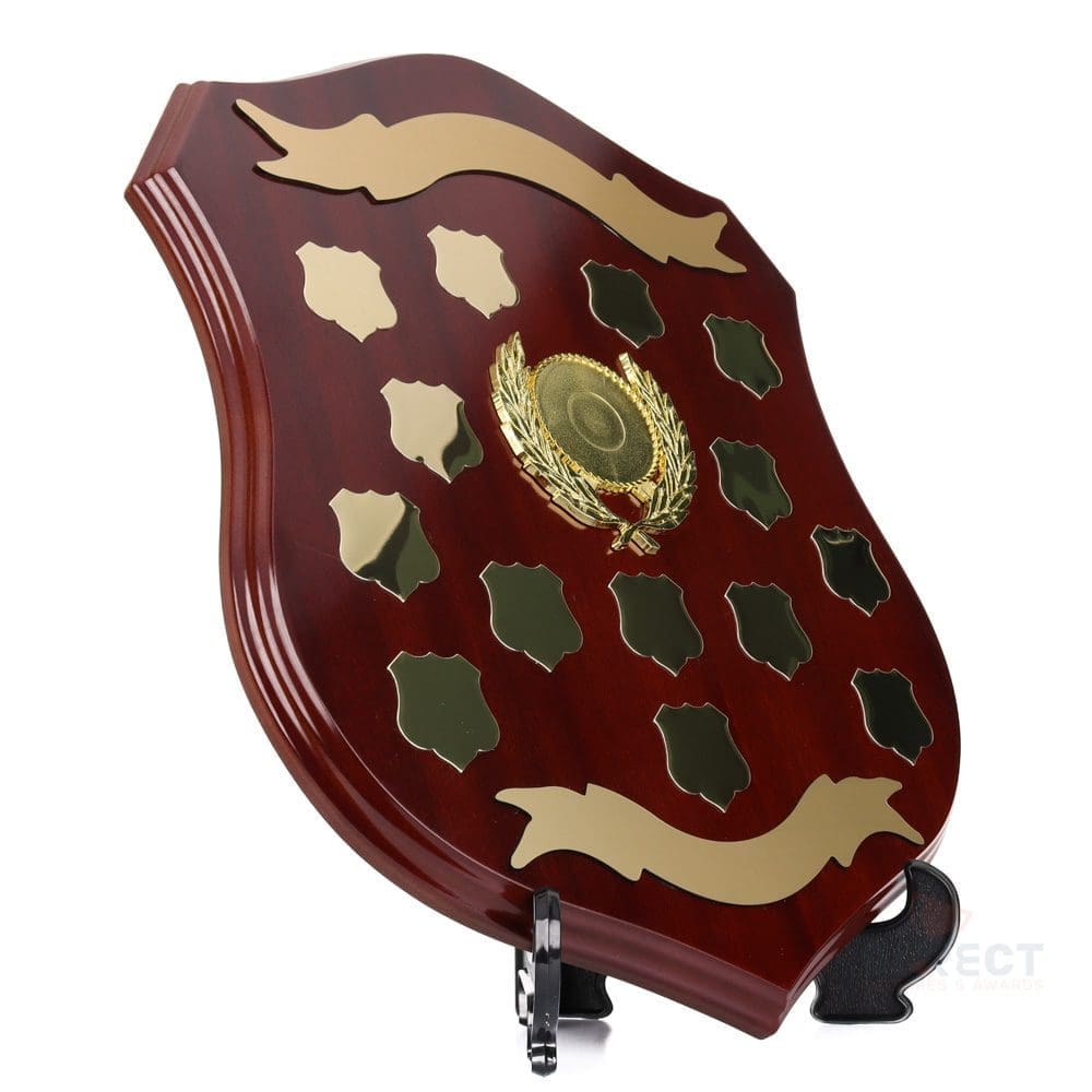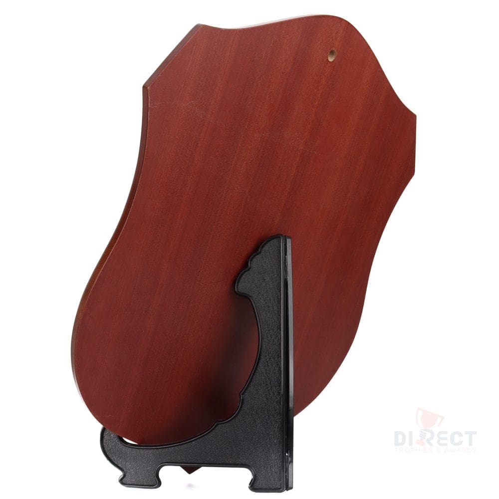 Classic series of timber shield in walnut finish. Supplied with plate and header setup as per layout shown. Engraving on ribbon plate included.