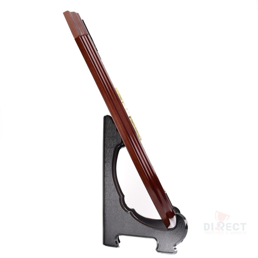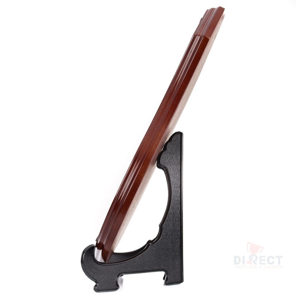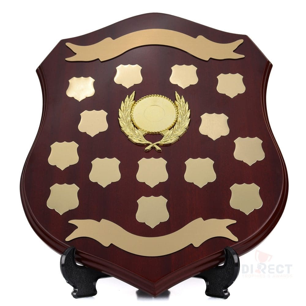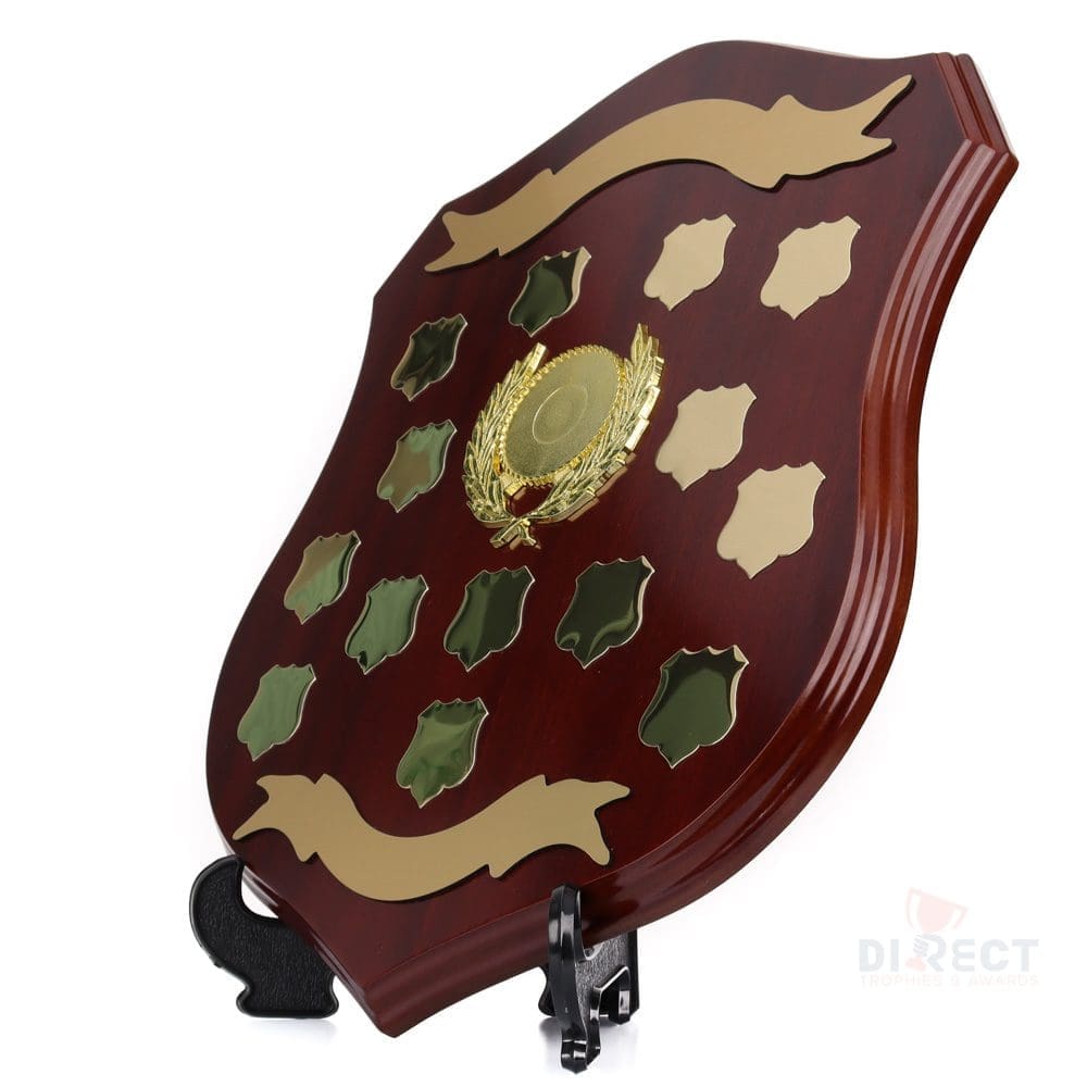 Classic series of timber shield in walnut finish. Supplied with plate and header setup as per layout shown. Engraving on ribbon plate included.