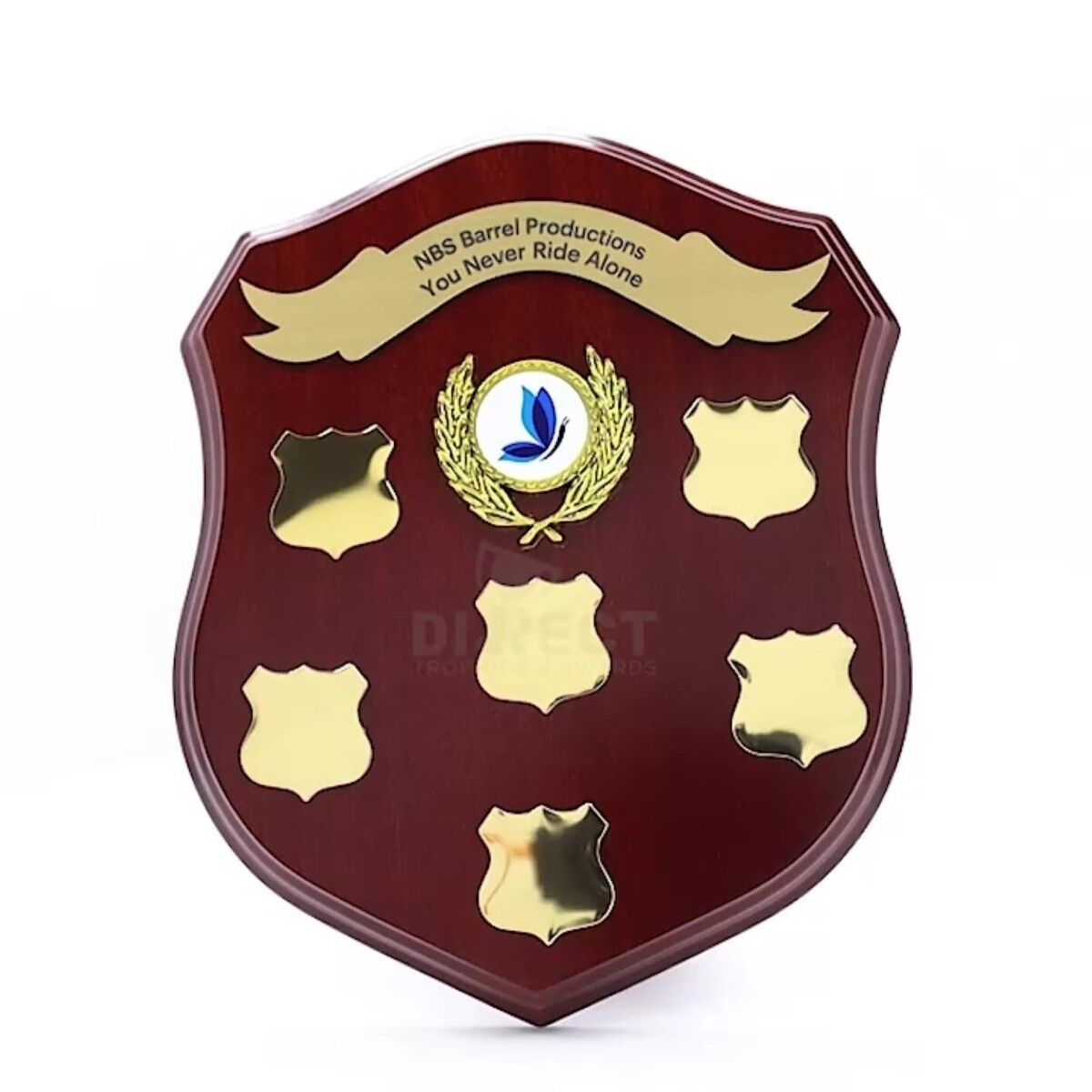 Classic series of timber shield in walnut finish. Supplied with plate and header setup as per layout shown. Engraving on ribbon plate included.