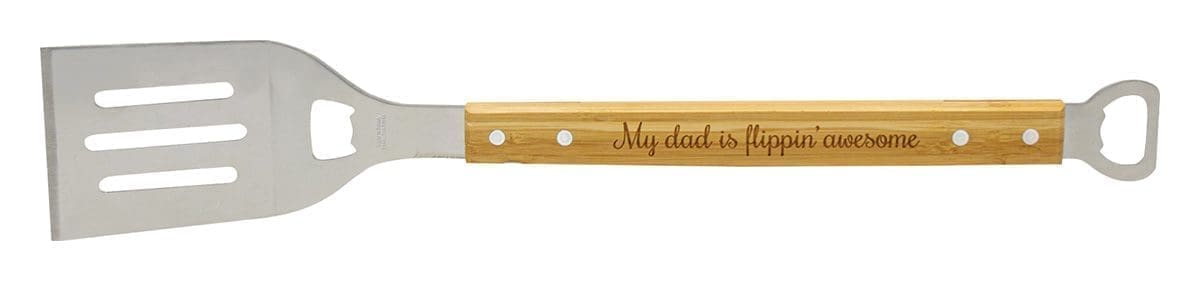 Fun & novel gift superbly crafted in bamboo and stainless steel – includes handy bottle opener and space to engrave that special message for that special BBQ chef.