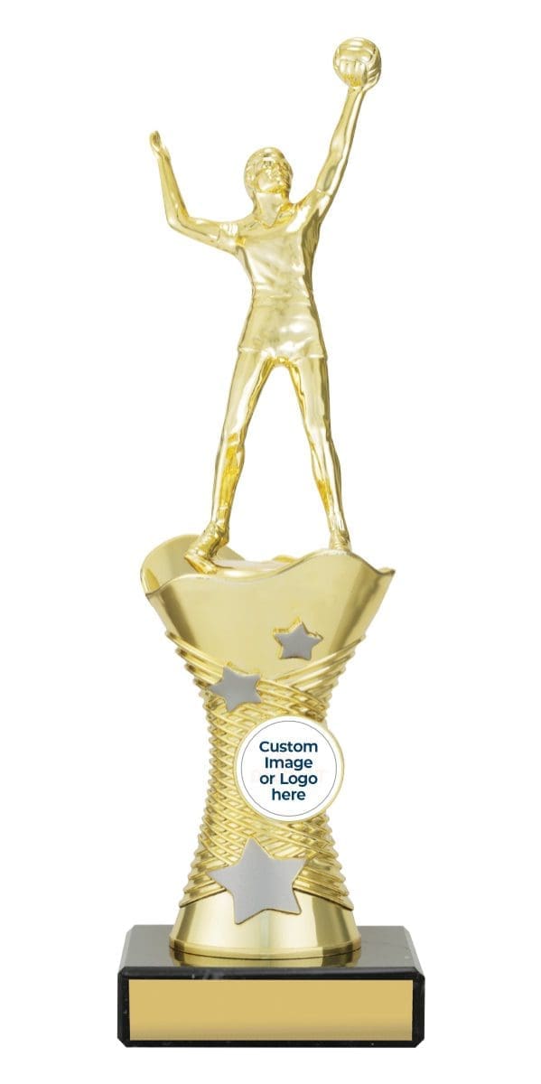 Introducing the Volleyball Trekaxis Gold Series Trophy showcases a dazzling Gold figurine design with a star pattern and vibrant multi-colored elements. Paired with classic black marble, it exudes elegance. Available in multiple sizes to cater to different award requirements. Available in 3 sizes. Gold figurine and marble base elevates this trophy award.