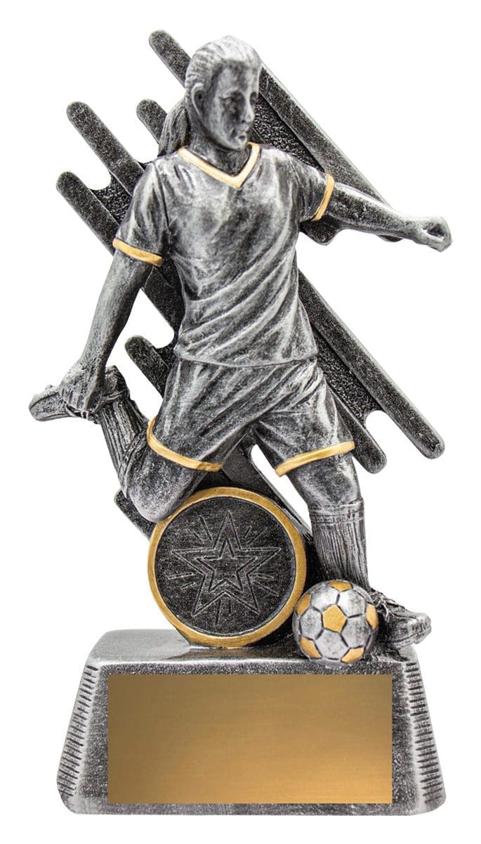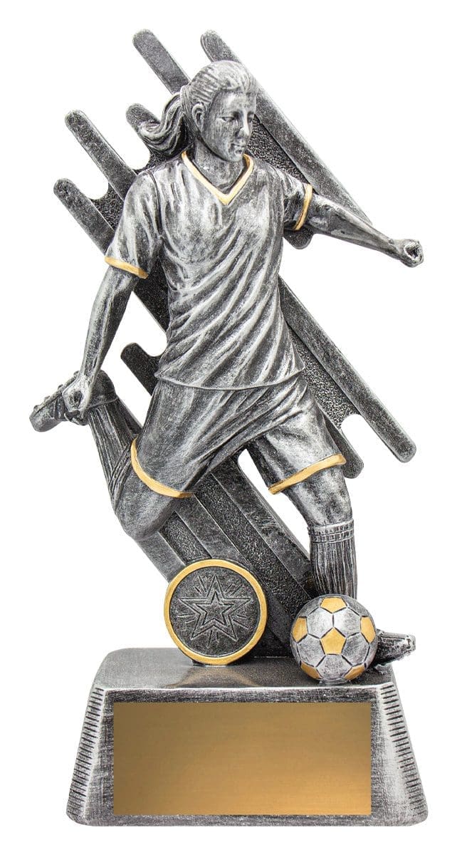 Zoom Series showcases Football player in action against a stylised backdrop and finished in classic antique silver. Available in multiple sizes and includes space for custom logo.