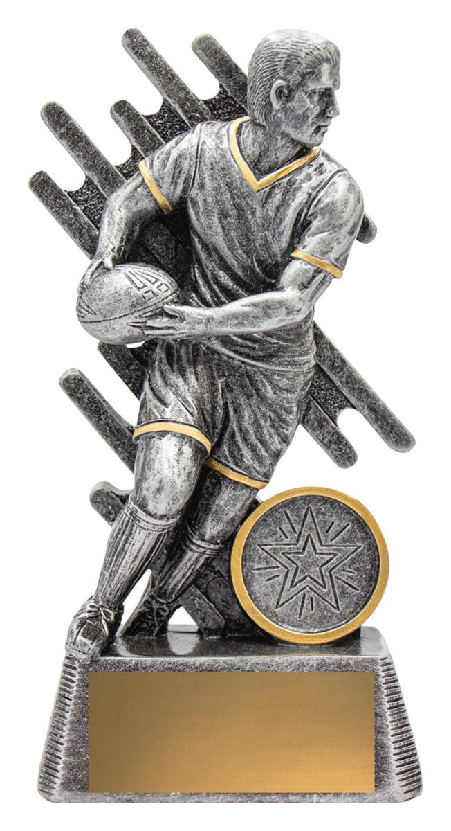 Zoom Series showcases Rugby League or Union player in action against a stylised backdrop and finished in classic antique silver. Available in multiple sizes and includes space for custom logo.